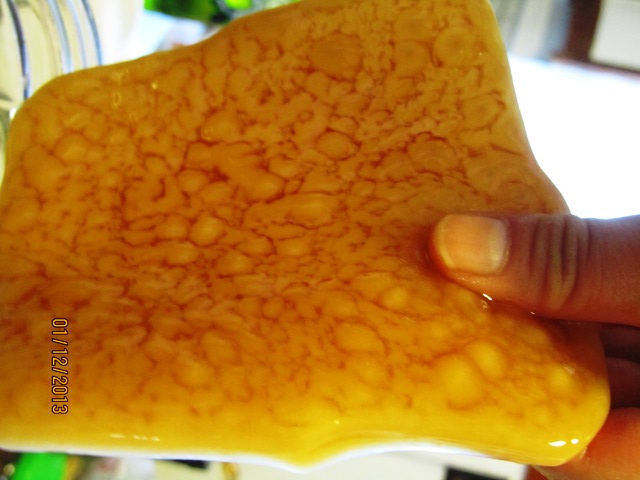 It has been a while since my first post about Kombucha.  My first Scoby Mama was born Jan 12, 2013.  She is a little soft and rubbery but I think she came out beautifully.  I left my Scoby to grow for about 2 weeks.  A Scoby is supposed to be ready when it is about 1/4 inches thick.  I monitored the temperature to be between 75 Degrees and 80 Degrees.  I also checked the pH of the Kombucha and it was at pH 3 which is perfect.