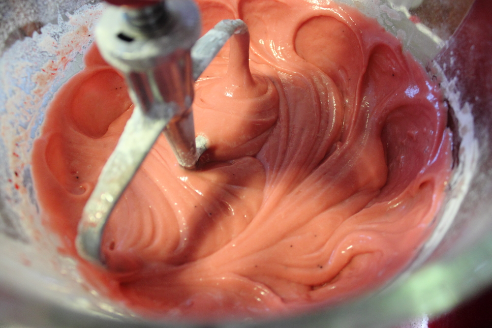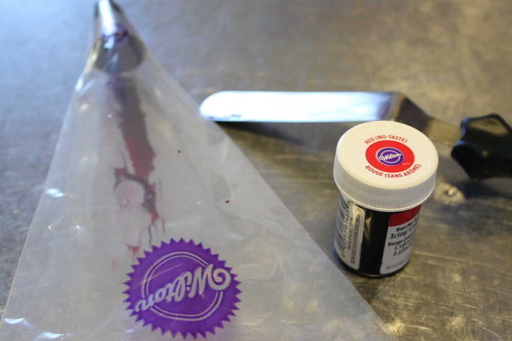 I decided for this cupcake, I needed to add a bit of colour.  I love the contrast of the white frosting to the red cupcake but I was a little disappointed with how the colour of the cupcake turned out.  I wanted to add a little punch of colour with the frosting.  To make a stripe of colour, use a metal spatula and gel food colour and place a streak of colour on the side of the icing bag.  When you frost the cupcakes, the icing drags the colour with it.