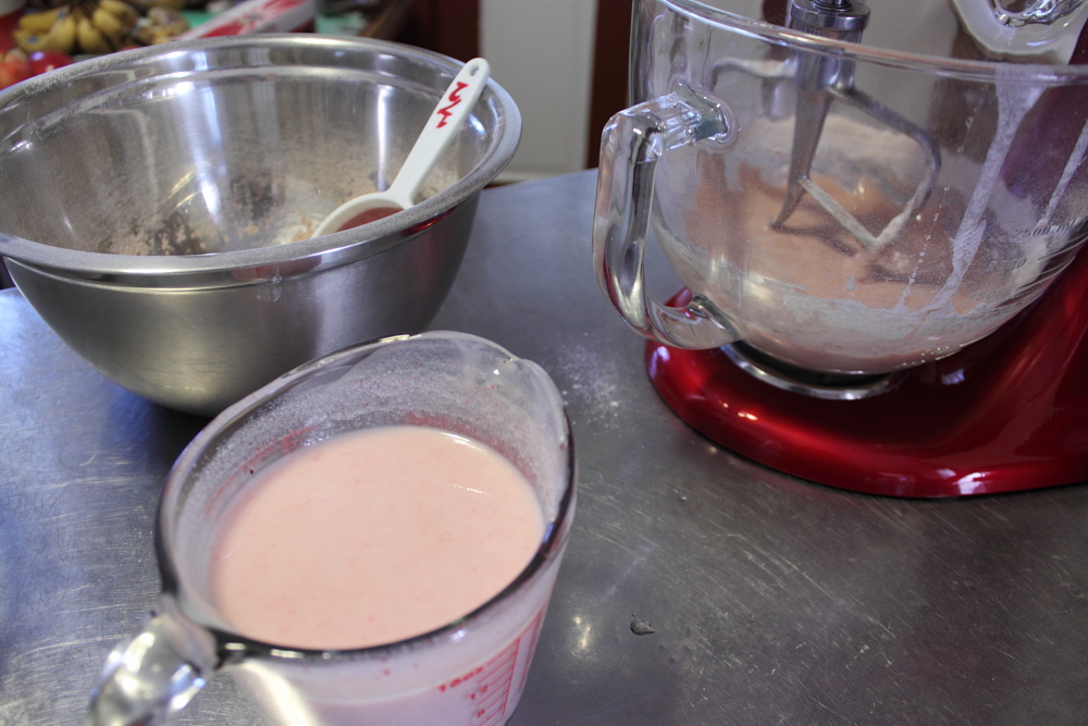 I get all the dry ingredients (flour, cocoa, salt and baking powder) ready in one bowl and the wet ingredients (buttermilk, oil and food colour) in measuring a cup.  I also start mixing the eggs with the sugar in my blender.  My grandmother always used to make sponge cake and would always beat the eggs and sugar until the sugar had dissolved.  It helps with making the batter rise when you bake it.