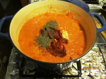 Add them to the pot and put in spices, bay leaves, and tomato paste. Simmer and enjoy! The longer you simmer the pasta sauce the more condensed the sauce will become. It will start getting a very rich note. The longer the sauce simmers the thicker the sauce will be. I don’t like mine too thick.