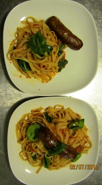 Boil pasta until al dente and toss in sauce. Make sure you are adding plenty of salt (I add about a palm full or 1/4 cup to a pot of water) to the water so the pasta doesn’t water down your sauce. Toss in spinach and serve with sausages or other fixings.