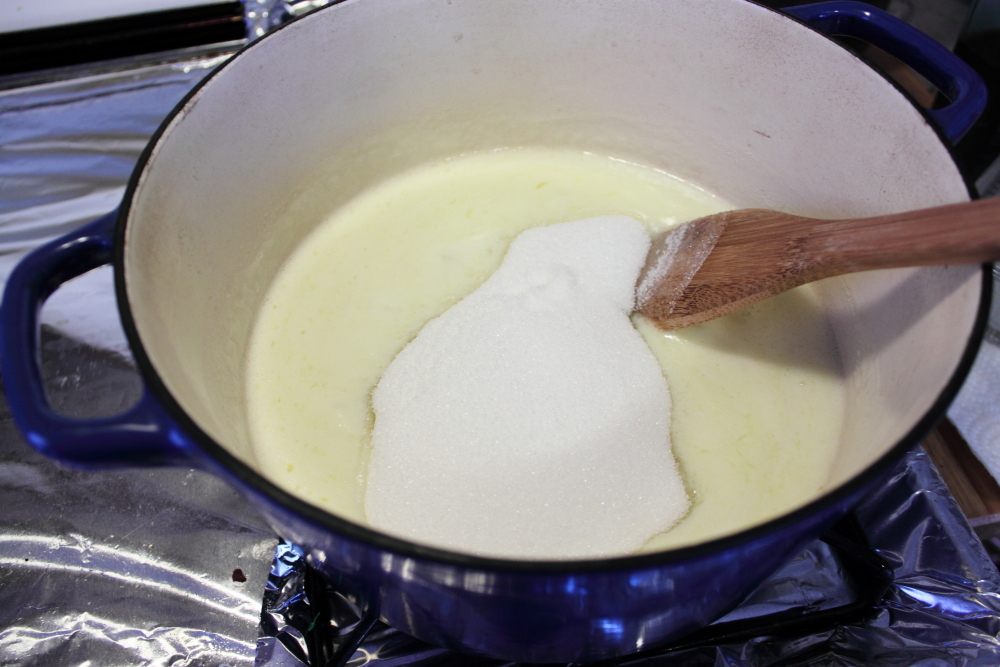 Like I said, this recipe begins with a wonderful thing known as butter. (Please do not substitute with margarine, it would not work or taste the same). Before adding the 2 cups of sugar, I like to melt the butter all the way.