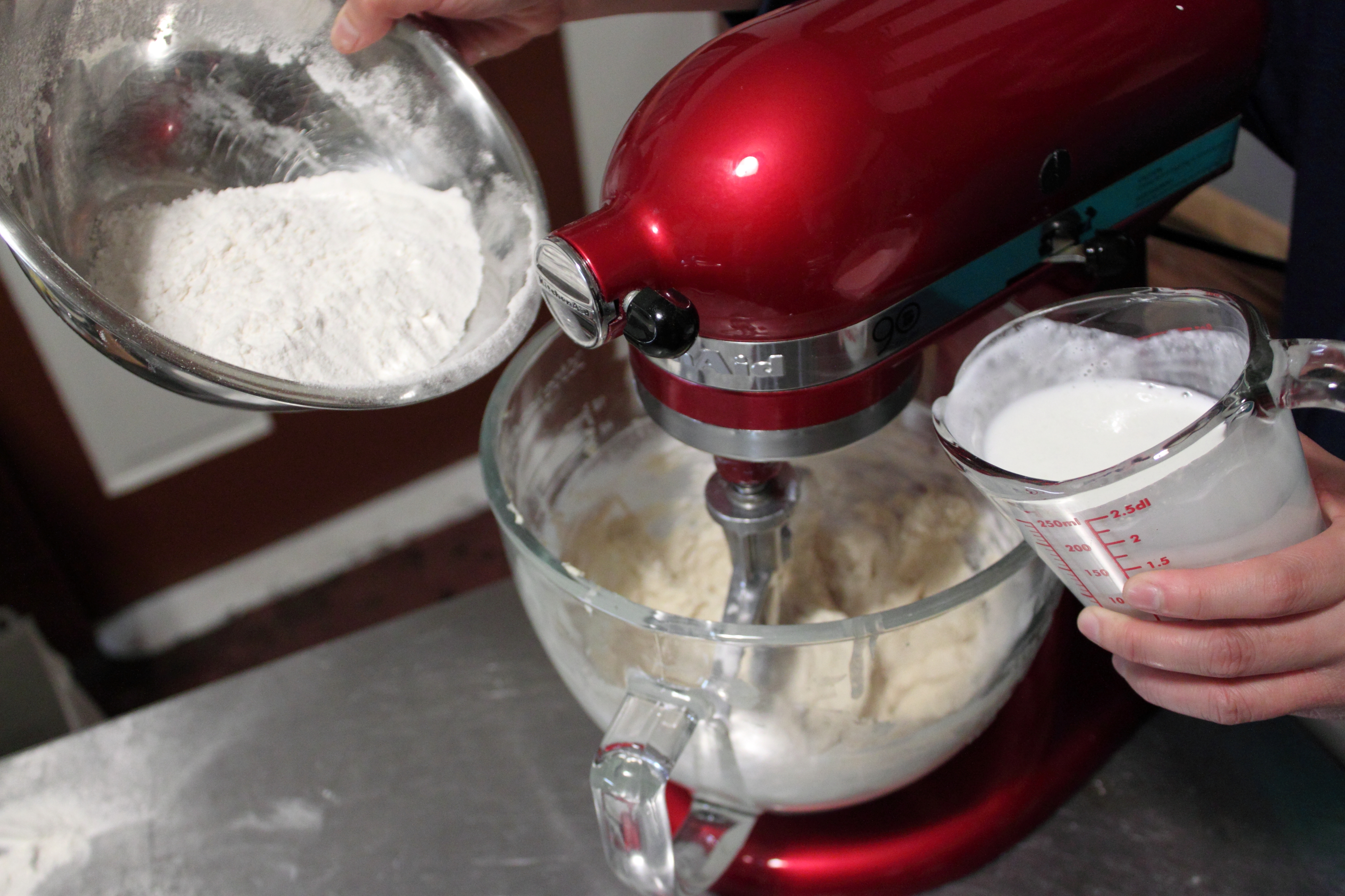 This recipe uses room temperature buttermilk. When you incorporate buttermilk and the flour, alternate. This helps the ingredients mix together while preventing over mixing. I like to start with the buttermilk first and then flour.