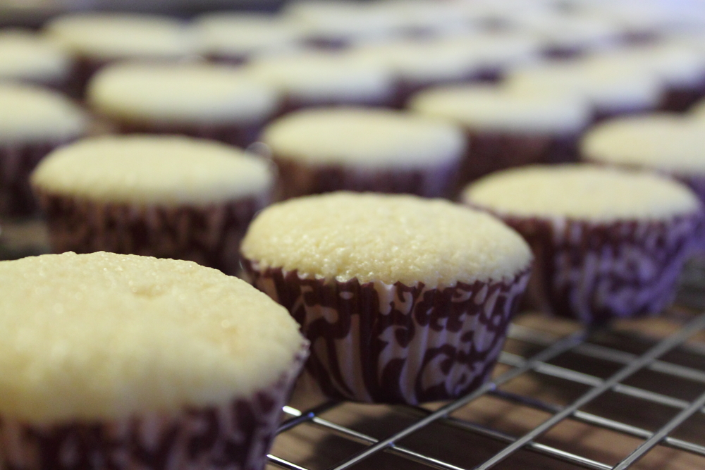 Portion out the batter into the cupcake liners using a scoop. I like putting my cupcake trays on a bigger tray as it is easier to put them in the oven. If you are using smaller cupcake tins, the baking time will be slightly different. Insert a toothpick into the cupcake at about 12 minutes to test if it is done. If the toothpick comes out clean, your cupcakes are ready.