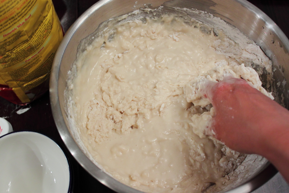 Add flour, 2 cups at a time until the dough becomes a ball. At this point, I kneaded it a little just to increase the gluten. Gluten helps give elasticity in the dough. It helps trap air pockets making the dough fluffy.