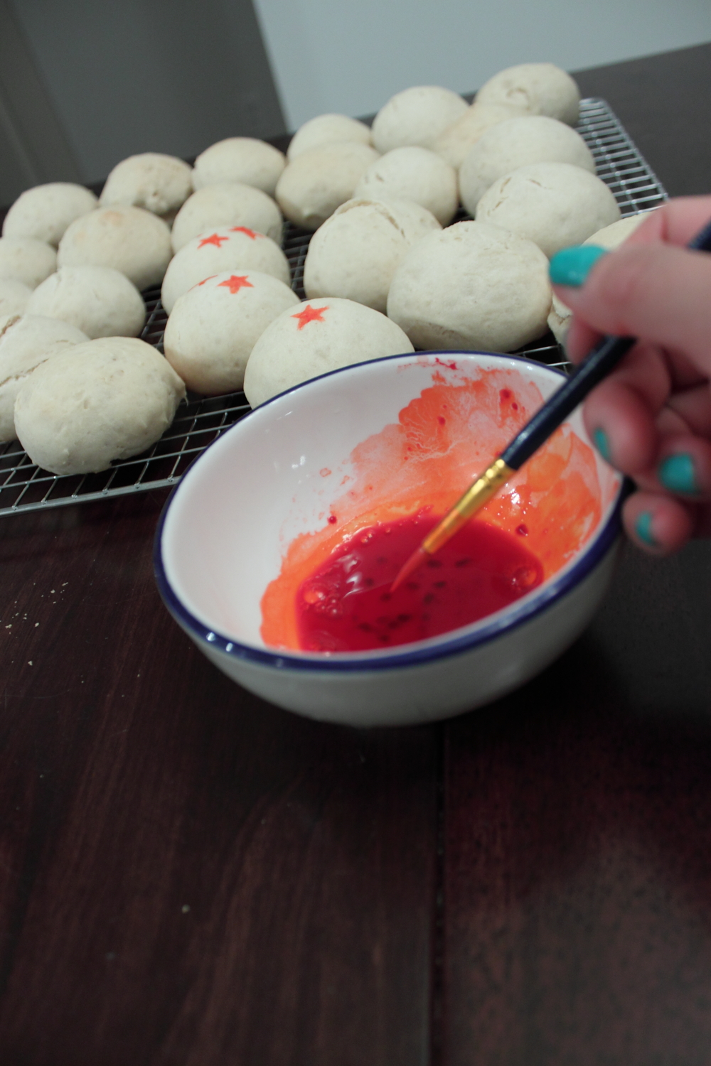 While the buns are cooling, prepare your food colour paint. I used some orange and red gel food colouring and mixed it with water. My gel food colouring was a little dry so it got lumpy. Using a clean paint brush (one that has not been used for anything other than food!) paint little red stars on the top of each buns.