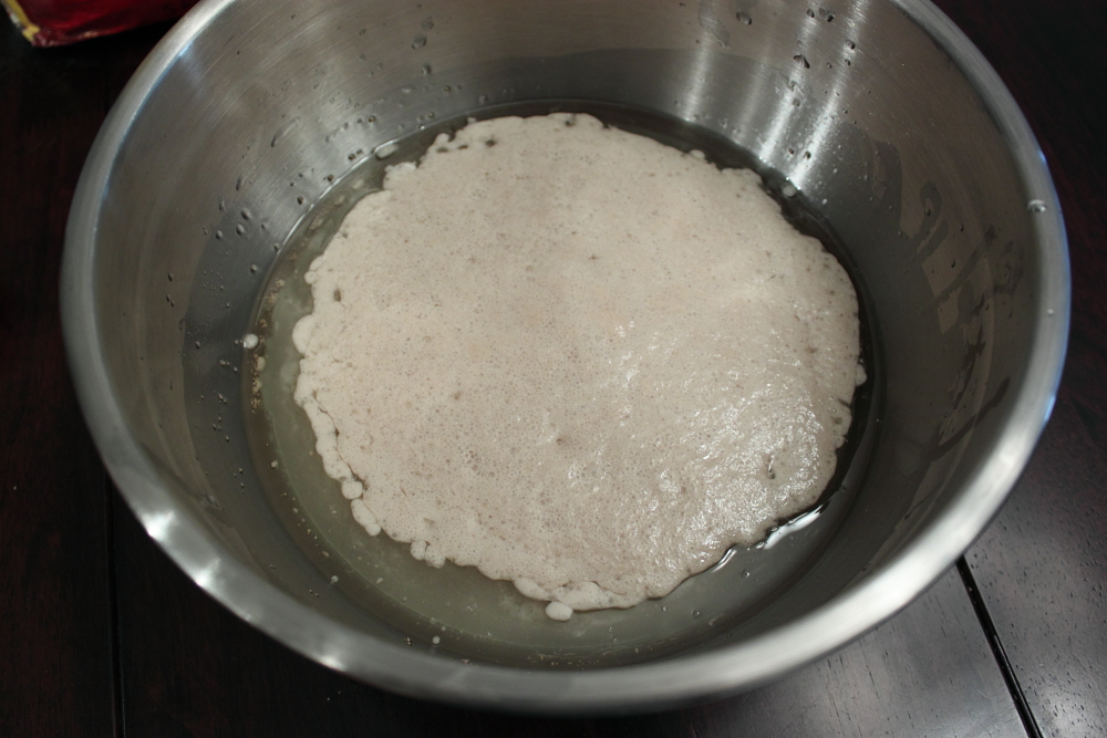 When I got home, I took the eggs out of the fridge. I mixed the sugar, oil, warm water and bread yeast in a bowl and left it on the stove to rise. Warm water and sugar help the yeast produce carbon dioxide which helps bread become nice and fluffy. Make sure your yeast has not expired since yeast is a living organism and expired yeast does not produce a lot of gas.
