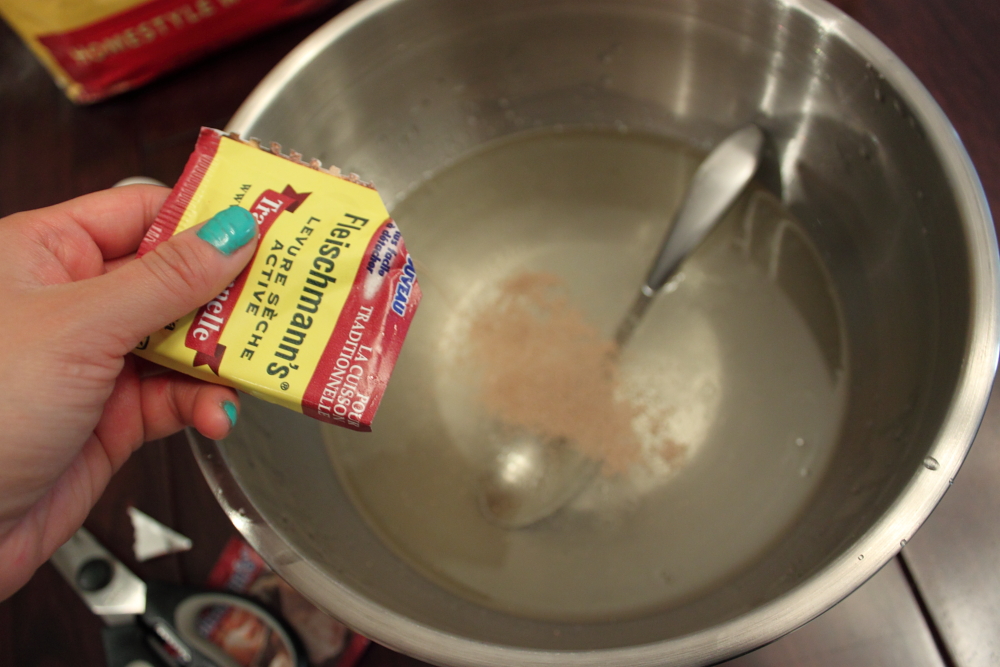 - In the bowl of a stand mixer, combine water, oil, yeast, and sugar. Allow mixture to rest for 15 minutes.