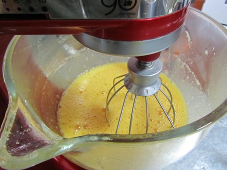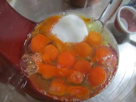 In a heat proof bowl whisk together the 6 eggs and 3/4 cup sugar. Set the bowl in a skillet of barely simmering water (or double boiler). Whisk until the mixture is about 110 degrees F. Remove the bowl from the heat and beat on high speed until the mixture is lemony in color and has tripled in volume. The eggs should be at the au ruban stage.
