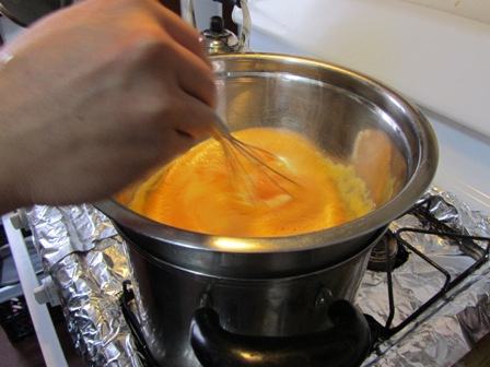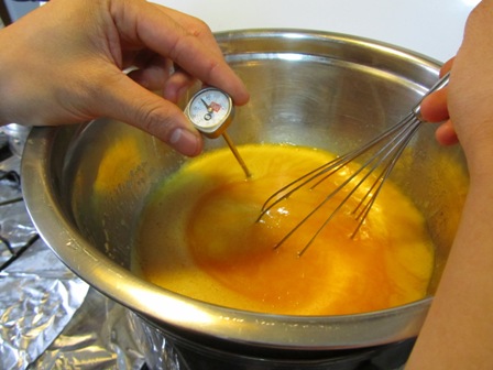 Set the bowl in a skillet of barely simmering water (or double boiler). Whisk until the mixture is about 110 degrees F.