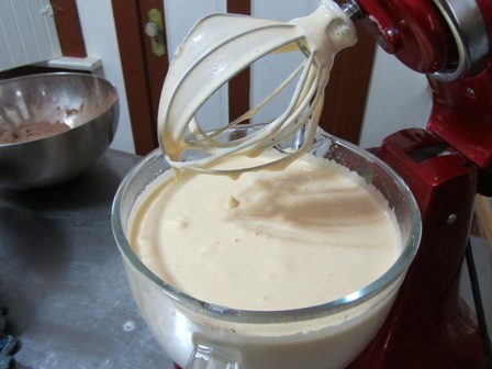 Reheat the butter until it is hot. Fold about 1 1/2 cups of the egg mixture into the butter until completely incorporated. Add the vanilla. Scrape the remaining egg mixture and fold in.