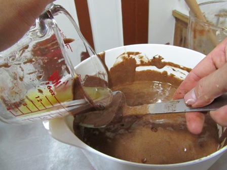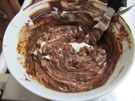 In 3 additions, sift in the flour and cocoa mixture and fold into the egg mixture gently.