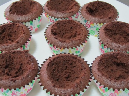 While the whipping cream is whipping, cut out the centers of your cupcakes. You will be filling them with cherries.