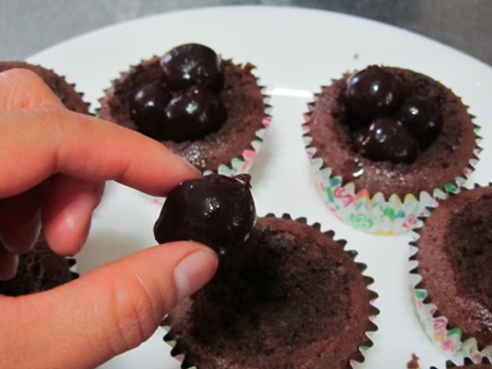 Place cherries in each cupcake.