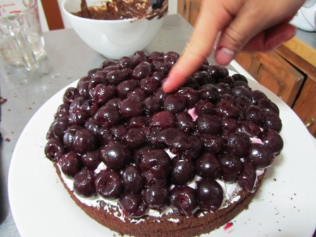 Begin with the first layer. Place the layer on your plate and moisten the top with the moistening liquid. Be generous. Put the chocolate whipping cream on top of the first layer. Moisten the bottom of the second layer. Place on top of the chocolate whipping cream. Moisten the top of the second layer. Spread a layer of whipping cream on the second layer. Arrange a single layer of cherries on the cake. Moisten the bottom of the last layer of the cake. Place the layer on top of the cherry layer. Frost the entire cake with whipping cream. Decorate the cake with the remaining cherries. You can shave some chocolate on top.