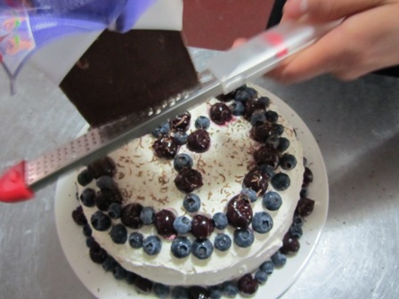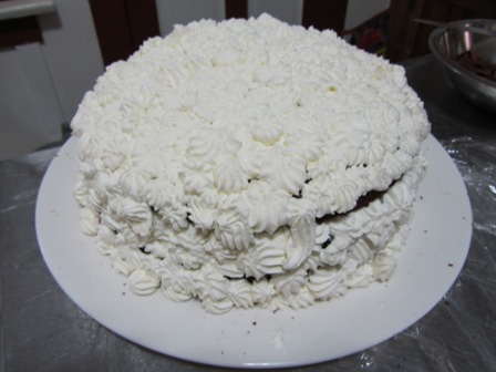 Place chocolate whipping cream on top of the cake.