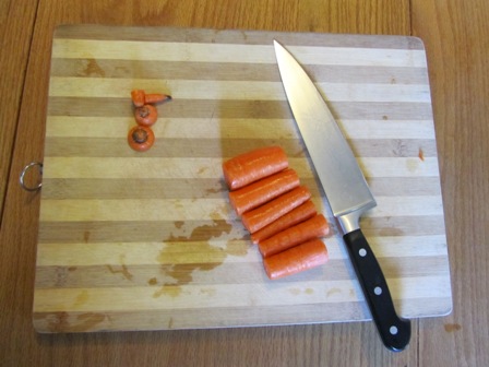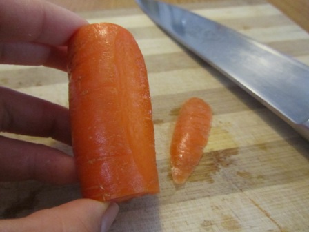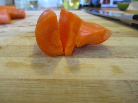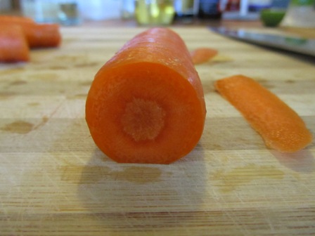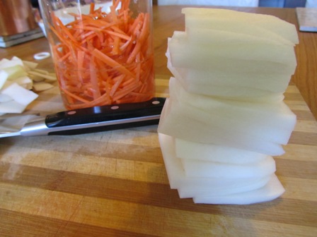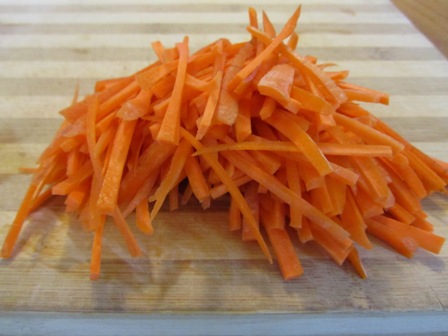 Julienne the carrots, diakon and jalapeno. To make sure you don’t cut yourself, slice a piece off the end of the carrot. This provides a flat surface to cut your carrot and will prevent any wobbling.