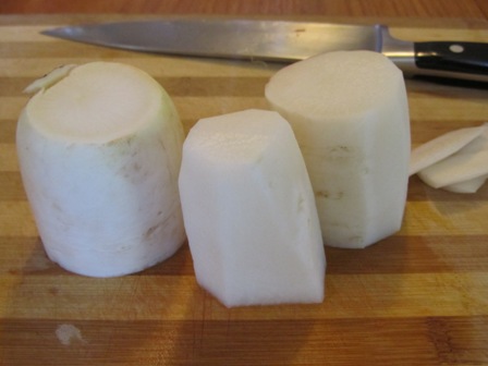 Continue with the daikon. First make sure you peel the diakon since the skin is a bit tough.