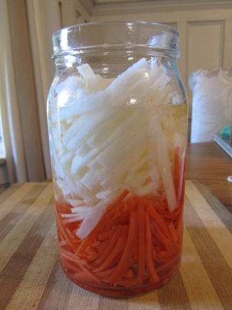 Mix the sugar, vinegar, and water together until the sugar is dissolved. Put julienne carrots, diakon and jalepeno peppers into a jar and pour enough pickling liquid to cover the vegetables. These vegetable will last a month or two.