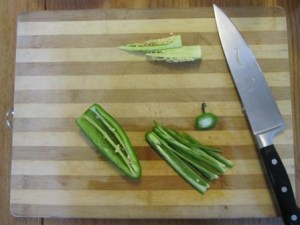 When you are cutting the jalapeno, make sure you wear gloves. The oils from the pepper will sting any open cuts and don’t rub your eyes! If you want the peppers to be spicier, leave the seeds and white membrane. If you want a milder pepper, remove the seeds and white membrane.