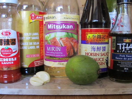 This recipe calls for lots of sauces. Begin by marinating the meat in mirin, soy sauce, fish sauce, rice wine vinegar, lime juice, garlic and sweet chili sauce. You can use any type of meat but I prefer chicken. Let the meat sit for at least an hour. Over night will even be better. Whenever I grill chicken I always use chicken thighs. They always remain juicy and never dry out.