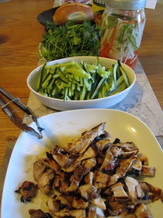 Lay your ingredients out and allow your guests to make their own sandwiches. Make sure you use extra crusty bread such as french bread or crusty rolls. It will make a huge difference. I like to spread a bit of mayo onto my bun before adding the rest of the ingredients: chicken, cilantro, pickled vegetable, red onion, and cucumber.