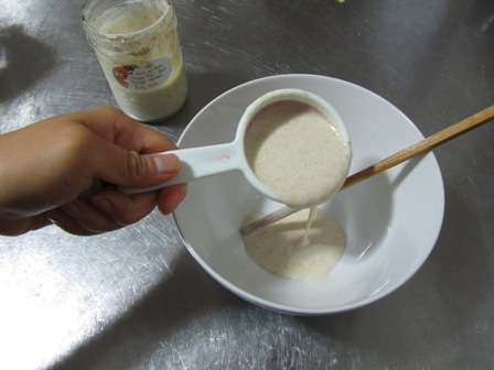 The day before you make your waffles you will need to activate your sourdough starter. I keep Carl in the fridge and feed him every week. I alternate between rye flour and white flour. Pour about 1/4 cup of sourdough starter in a bowl.