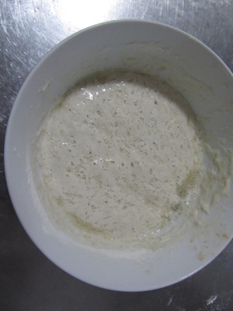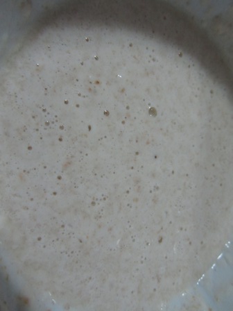 This is what the starter looks like after the second feeding. There will be more bubbles that the first time.