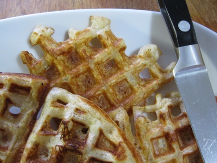 Once out of the machine, the waffles are nice and fluffy. They are crispy and light. If you are making a whole bunch place them on a baking sheet in a 300 degree oven to keep them warm and crispy. These waffles were sweet enough on their own but tasted great with syrup and jam. Enjoy!