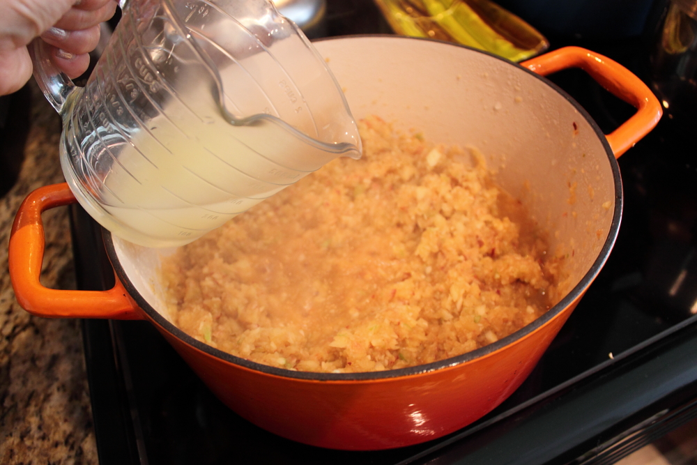 Add the chopped apples to a heavy pot. I love using my Le Creuset cast iron pot because of the even cooking. Add the 1/4 cup lemon juice to the pot to help cook the apples. Adding it at this time will help prevent the apples from browning too much. (You don’t want brown jam! YUCK!).