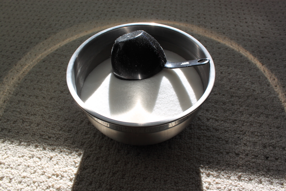 Measure out the sugar and add part of it to the blueberries (I used more blueberries than the recipe asked for so I could get a really strong blueberry taste). I also used about 4 1/2 cups of sugar instead of 5 cups because it makes it too sweet. Be careful with reducing the amount of sugar because this causes the jam to have a shorter shelf life.