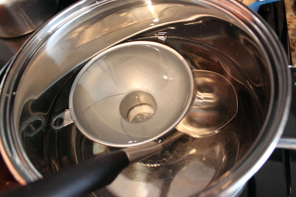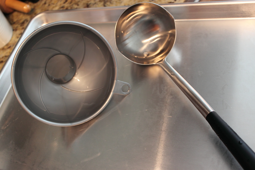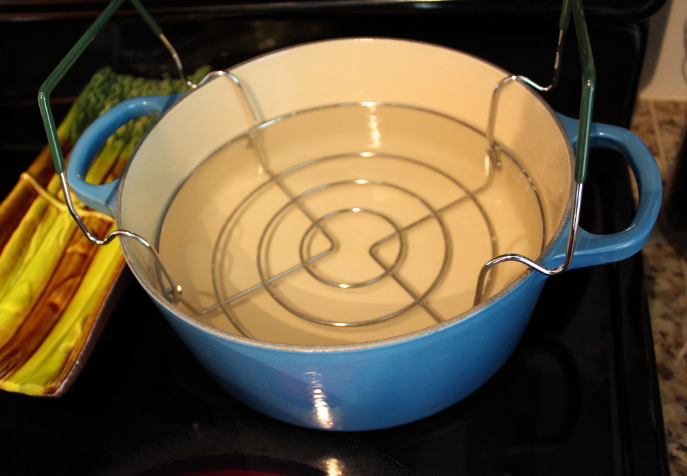 Prepare the pot by adding water and boiling it. I bought a fancy jam jar lifter and a jam funnel. Make sure to sterilize everything that would be in contact with the jam. This includes the ladle and the tray you place the ladle on! This helps prevents any unwanted bacteria or mold growth.