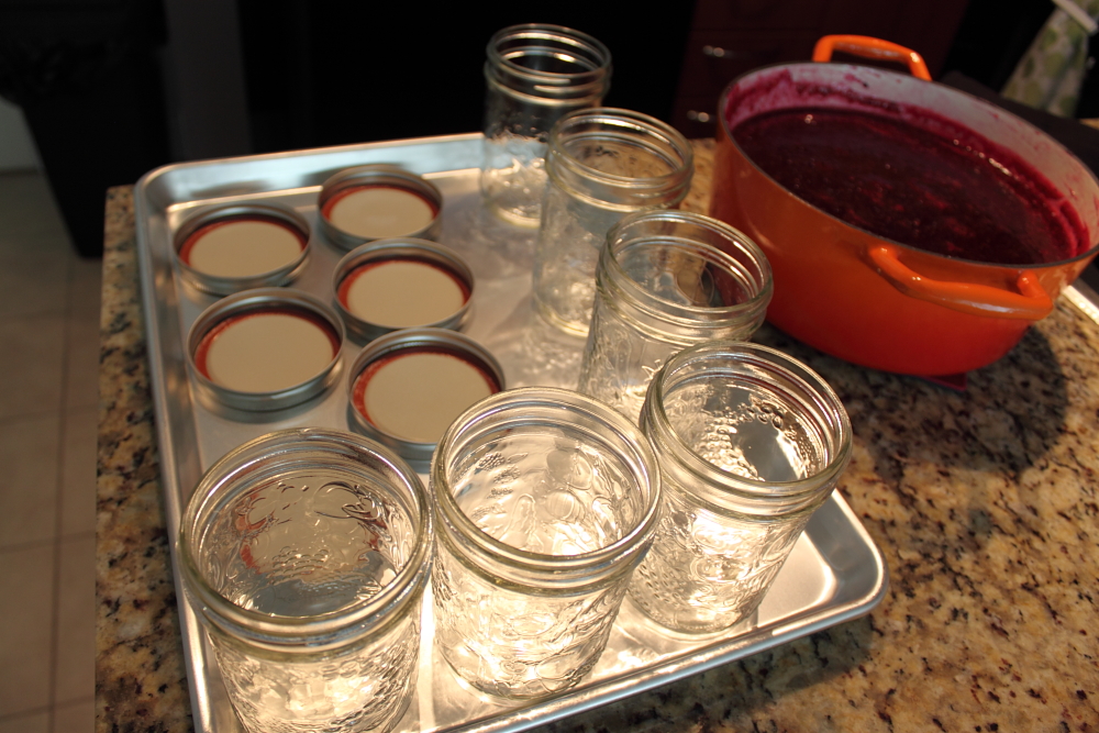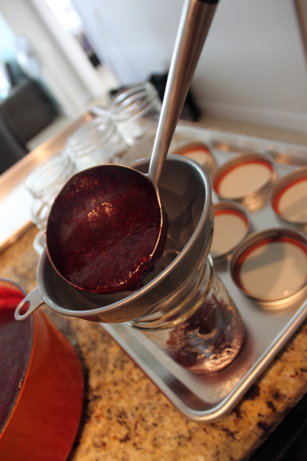 When the jam is ready, you can begin canning!! This is my favourite part! Have the jars and lids on a tray to prevent messy spills. A jam funnel also prevents dripping jam all over the edge.
