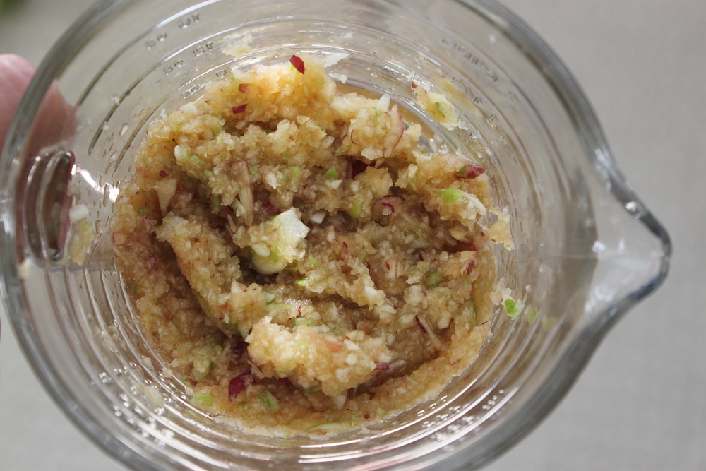 To speed up the chopping process, I put all the apples in a chopper. The finer you chop the apples, the more of a smooth jam you get. It is also faster to cook the apples this way. I also kept the skins on the apples but you can remove them if you want. You should have about 3 cups of chopped apples. This should be about 4-5 medium apples.