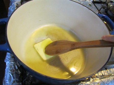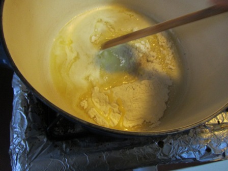 Start your recipe by making basic white sauce. Melt 1/4 cup unsalted butter in a pan. Add the flour and stir for about a minute.