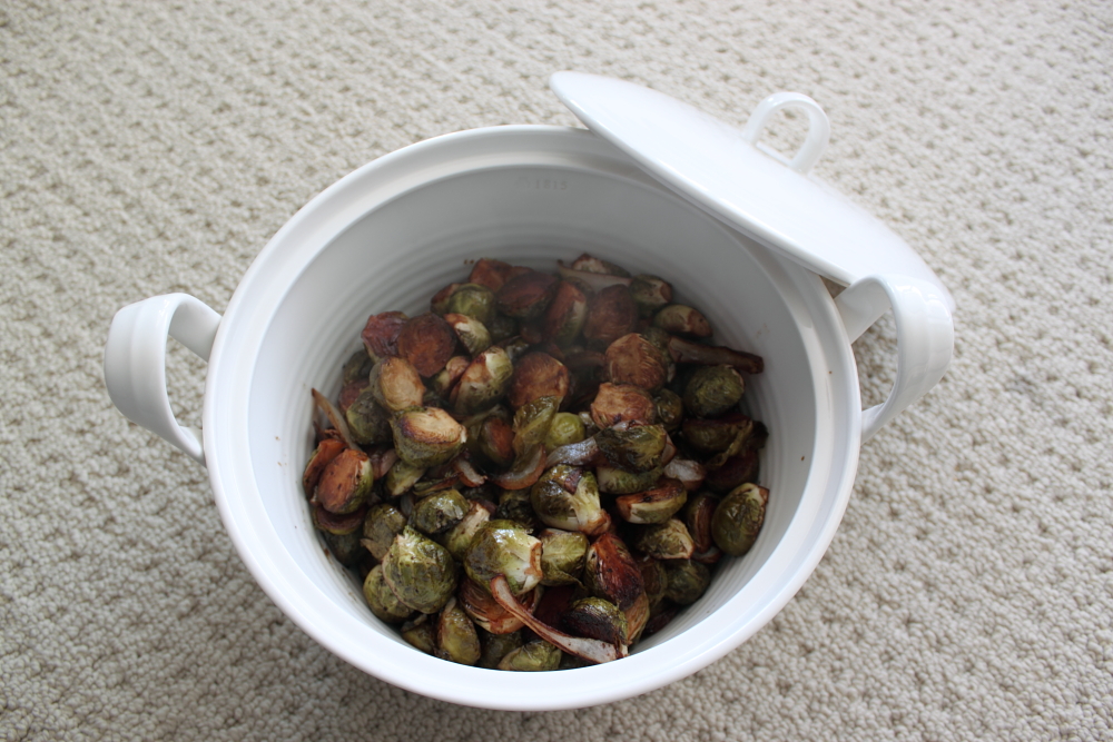 I like to take the outer portion of the brussel sprouts off and cut them in half. This helps them cook evenly and prevent over cooking which causes them to be mushy.