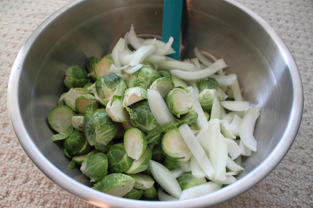 When the brussel sprouts are prepared and cut, slice some onions and mix them in with the brussel sprouts.