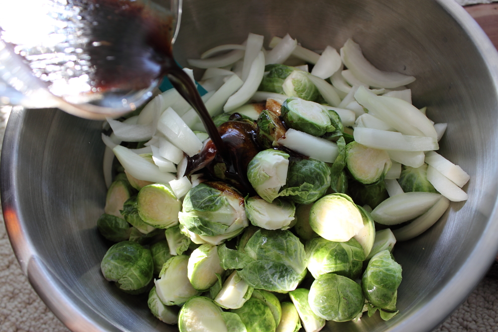 Pour the dressing over the brussel sprouts and onion and give it a good mix. You want to make sure all the sprouts and onions are coated with the dressing