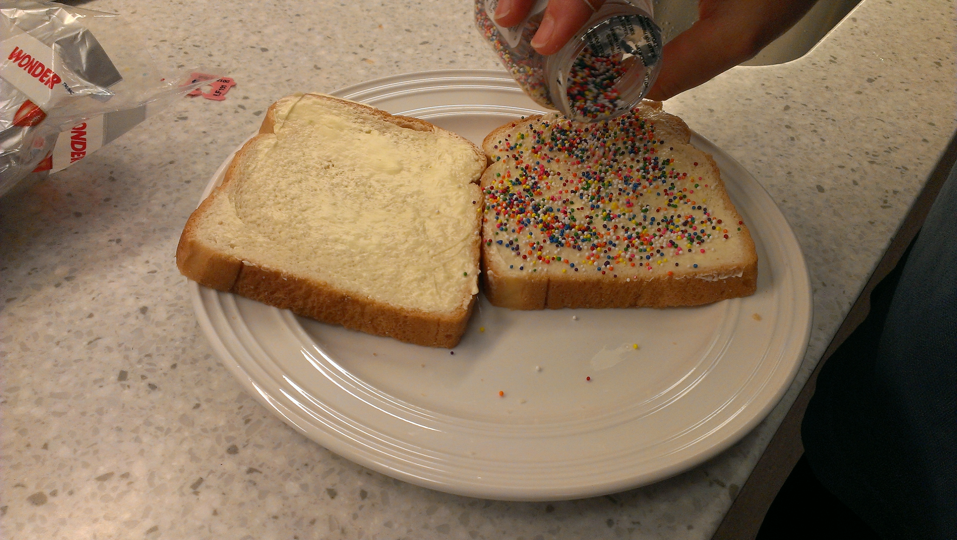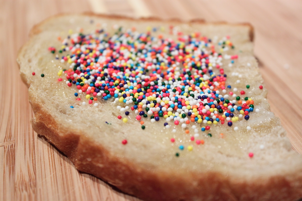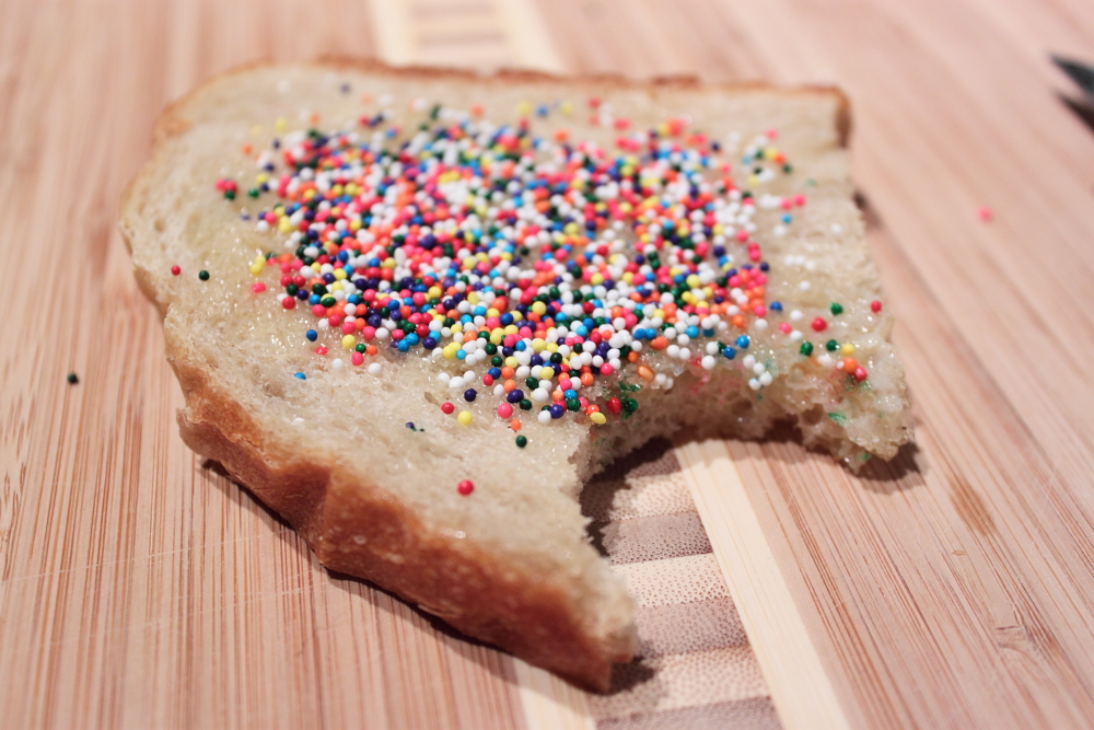 Of course life would not be the same if I had just any plain white toast with sprinkles. I had to try making fairy bread with some homemade sour dough bread!