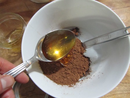 First start by melting the coconut oil. Mix in vanilla, honey and cocoa powder.