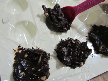 Line your container with plastic wrap. I used cake pop molds for this recipe, but you can use any tray. The chocolates can be cut after it hardens. Place the tray in the fridge for a couple of hours until the chocolate hardens.
