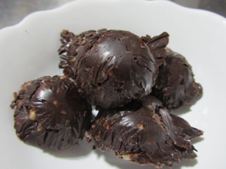 Melt the coconut oil in the microwave for about 2 minutes or until the oil is slightly melted. Add the honey, vanilla and cocoa powder and nuts. Mix well. Line a container with some plastic wrap. This will help the chocolates come out of the mold. Place in the fridge for a couple hours to harden. Leave the chocolates in the fridge since it melts easily.