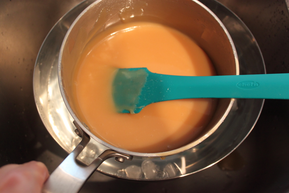 3. Stir in the salt and remove the pan from the heat, shocking the pan in cold water. Remove the vanilla bean with tongs, and set aside to allow the caramel to cool slightly.