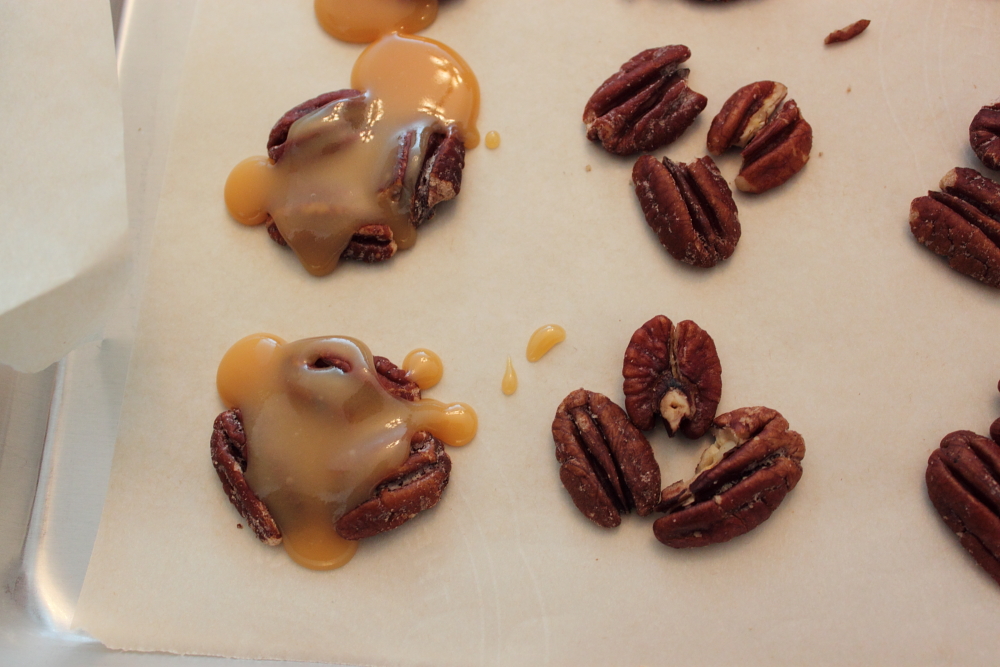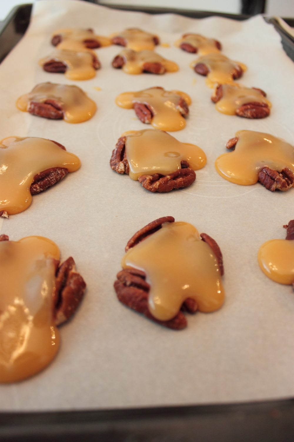 1. On a parchment lined or greased baking sheet or small muffin tin, place the toasted pecans in groups of 5 (baking sheet) or groups of 3 (muffin tin).
