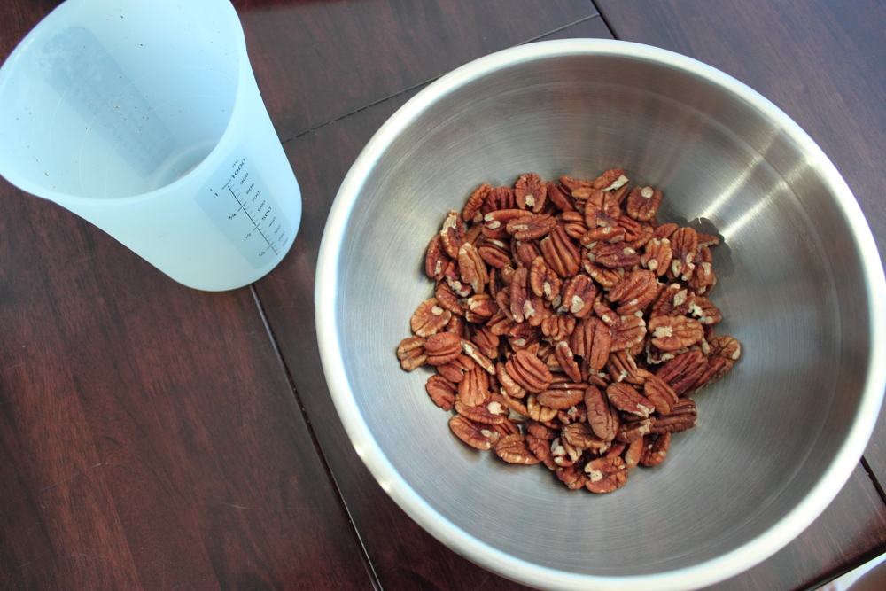 To begin these delicious treats, start with the pecans. Measure them out and put them in a bowl.
