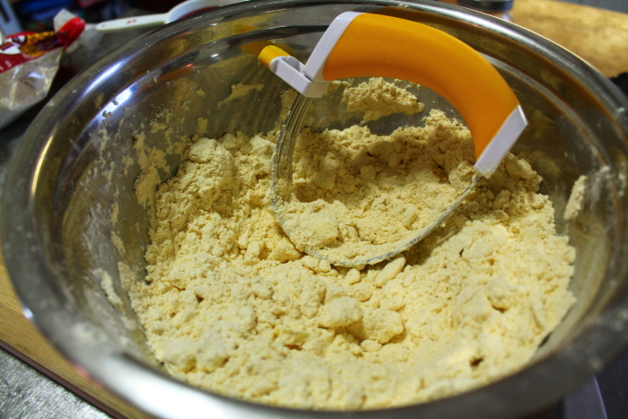 Begin by mixing up flour, sugar, extra cold butter, almond extract and cold water. The key to making a crust is keeping everything nice and cold. Try not to use your hands. Cut the butter with a pastry cutter. The mixture is ready when you have pea sized chunks.