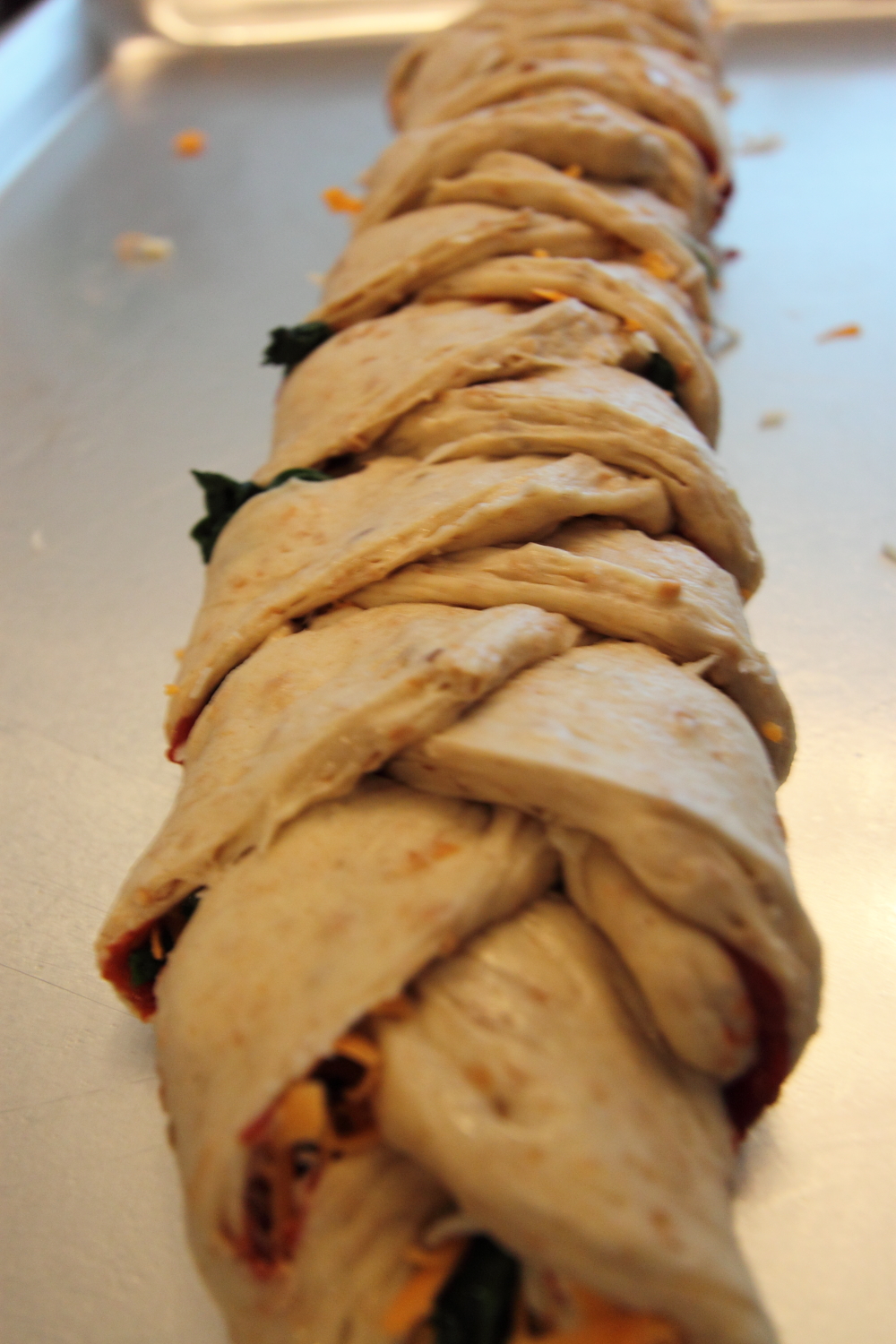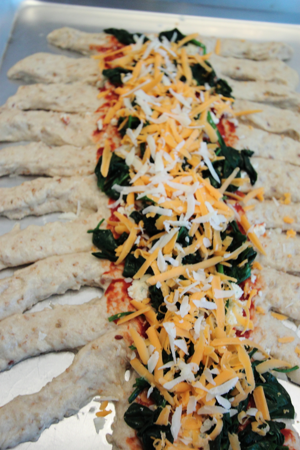 Roll out the pizza dough to make a rectangle. For ease, place this directly on a baking tray after rolling. Cut the dough along the edge. This will be need for the braid.