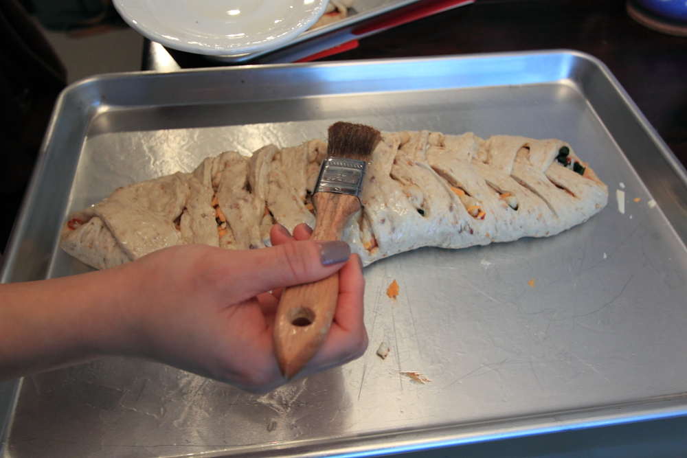 Once you are done, brush the entire bread with an egg yolk wash. (Separate the egg yolk from the egg white. Beat the egg yolk and brush that over the bread). Egg washes help create a nice brown crust on the bread.