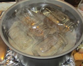 Pour the boiling liquid into the jars leaving about 1/2 inch air space on the top. Place lids back on the jars, screw the lids firmly but stop when you feel resistance. Place jars back into boiling water.