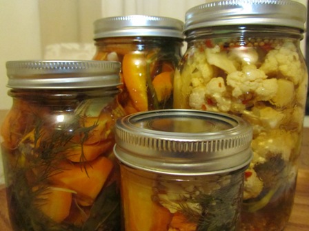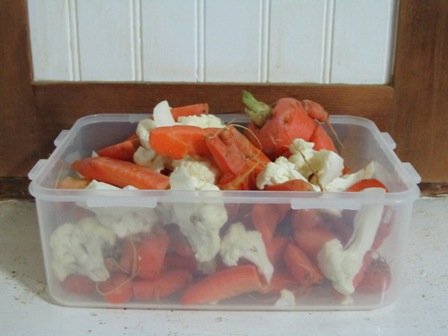 Pack the jars with your choice of vegetables. We used carrots and cauliflower. Pack them firmly.